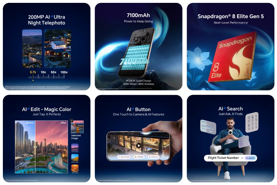 Yangi Magic 8 Pro BAA bozorida Snapdragon 8 Elite Gen 5 protsessori bilan taqdim etilgan ilk smartfon bo‘ldi. HONOR’ning ta’kidlashicha, chip avvalgi avlodlarga nisbatan samaradorlik va issiqlik boshqaruvida sezilarli yaxshilanishni ta’minlaydi. Smartfon 7100 mA·soat sig‘imli kremniy–uglerod batareyaga ega. U 100 Vt simli SuperCharge va 80 Vt simsiz quvvatlashni qo‘llab-quvvatlaydi.