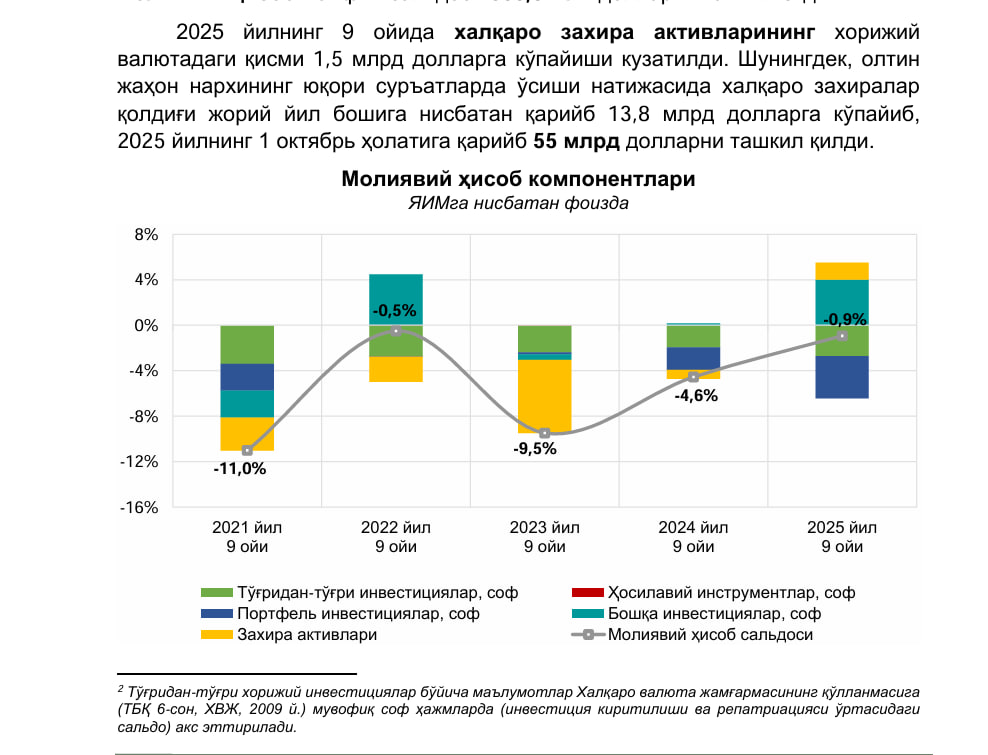 Markaziy bank ma’lumotlariga ko‘ra, joriy operatsiyalar hisobi taqchilligi moliyaviy hisob orqali, ya’ni to‘g‘ridan to‘g‘ri xorijiy investitsiyalar, portfel investitsiyalar va boshqa moliyaviy mablag‘lar hisobiga moliyalashtirilgan. 2025-yilning 9 oyida to‘g‘ridan to‘g‘ri xorijiy investitsiyalarning sof kiritilishi o‘tgan yilga nisbatan 1,7 barobarga o‘sib, 2,9 mlrd dollarga yetgan.