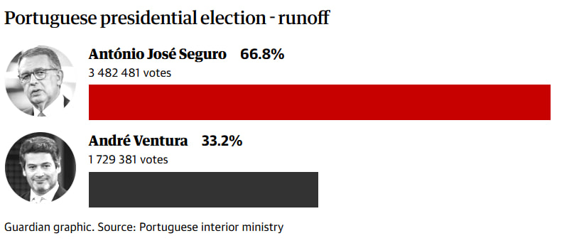 Portugaliyada prezidentlik saylovining ikkinchi bosqichida sotsialist nomzod António José Seguro ishonchli g‘alabaga erishdi. Bu haqda The Guardian ma’lum qildi. U ovozlarning 66,8 foizini olgan. Uning raqibi, o‘ta o‘ng Chega partiyasi yetakchisi André Ventura 33,2 foiz bilan rekord natija qayd etdi.