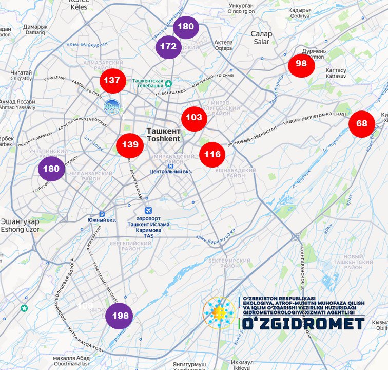 2025-yil 17-noyabr kuni soat 09:00 holatiga ko‘ra avtomatik monitoring stansiyalari Toshkent havosida ifloslanish darajasi oshganini ko‘rsatdi. Bu haqda O‘zgidromet xabar berdi.